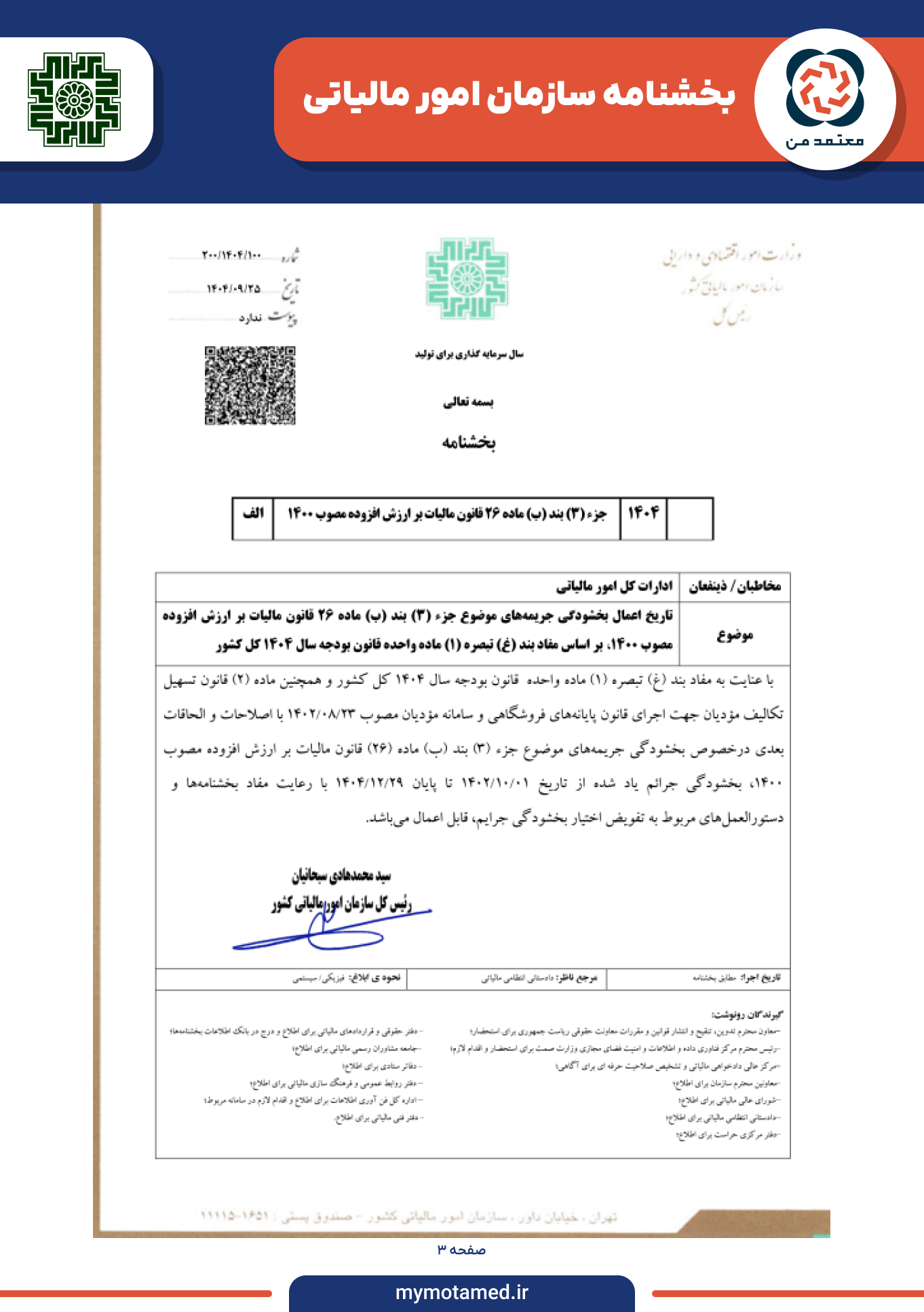 سازمان امور مالیاتی، بخشودگی جرایم جزء (۳) بند (ب) ماده (۲۶) قانون مالیات بر ارزش افزوده را اعمال می‌کند. این بخشودگی جرایم، بازه زمانی ۱ دی‌ماه ۱۴۰۲ تا ۲۹ اسفند ۱۴۰۴ را شامل می‌شود. سازمان این بخشودگی را با رعایت دستورالعمل‌های تفویض اختیار اجرا می‌کند. قانون بودجه سال ۱۴۰۴، ماده ۲ قانون تسهیل تکالیف مودیان را در این سال لازم‌الاجرا اعلام کرد. این قانون، جرایم جزء (۳) بند «ب» ماده ۲۶ قانون مالیات بر ارزش افزوده را نیز پوشش می‌دهد.
