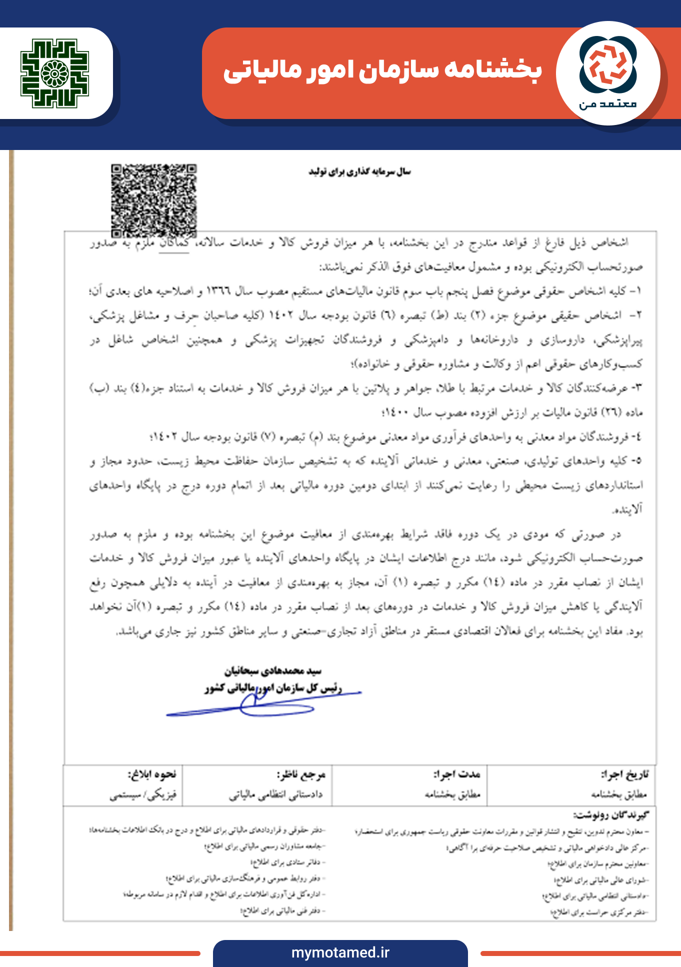 به گزارش رسانه مالیاتی ایران، سیدمحمدهادی سبحانیان رئیس کل سازمان امور مالیاتی کشور بخشنامه مربوط به