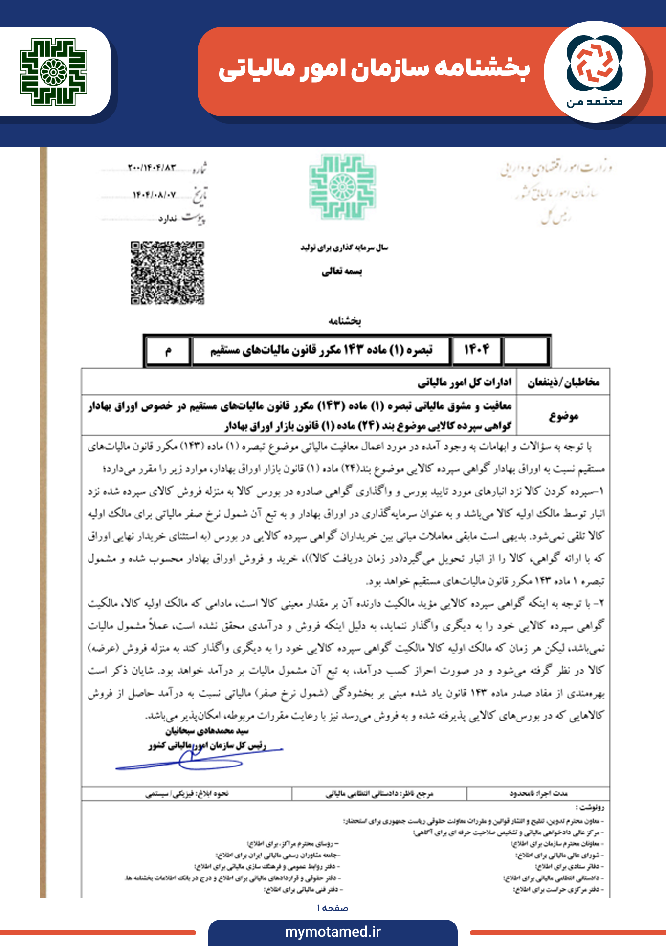به گزارش رسانه مالیاتی ایران، سیدمحمدهادی سبحانیان، رییس‌کل سازمان امور مالیاتی کشور، بخشنامه‌ای درباره معافیت‌ها و مشوق‌های مالیاتی صادر کرد. او این بخشنامه را بر اساس تبصره‌ (۱) ماده‌ (۱۴۳) مکرر قانون مالیات‌های مستقیم ابلاغ کرد. این بخشنامه به اوراق بهادار گواهی سپرده کالایی موضوع بند (۲۴) ماده‌ (۱) قانون بازار اوراق بهادار مربوط می‌شود.