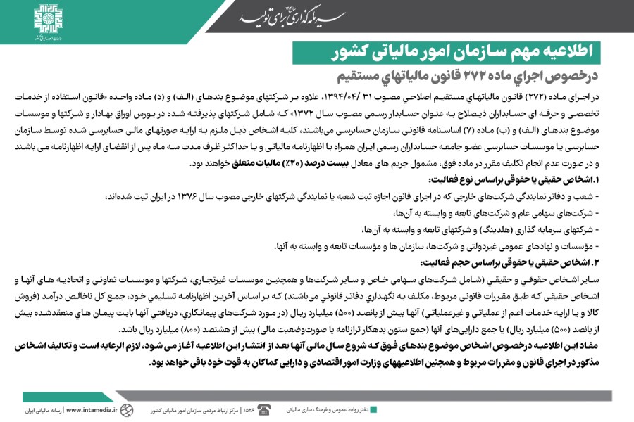 مفاد این اطلاعیه درخصوص اشخاص موضوع بندهای فوق که شروع سال مالی آنها بعد از انتشار این اطلاعیه آغاز میشود، لازمالرعایه است و تکالیف اشخاص مذکور در اجرای قانون و مقررات مربوط و همچنین اطلاعیههای وزارت امور اقتصادی و دارایی کماکان به قوت خود باقی خواهد بود.