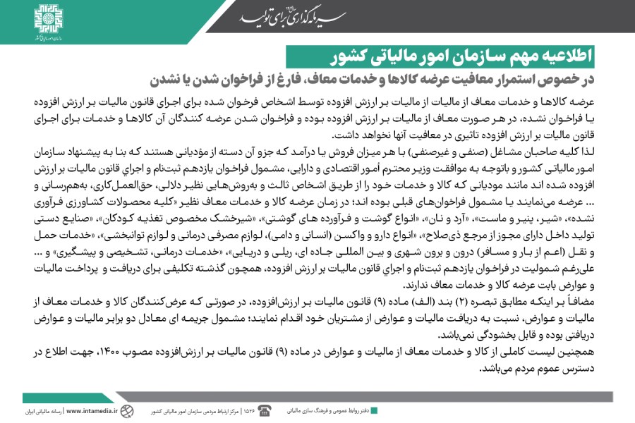 فراخوان شدن عرضهکنندگان برای اجرای قانون مالیات بر ارزش افزوده، تاثیری بر معافیت آنها ندارد.